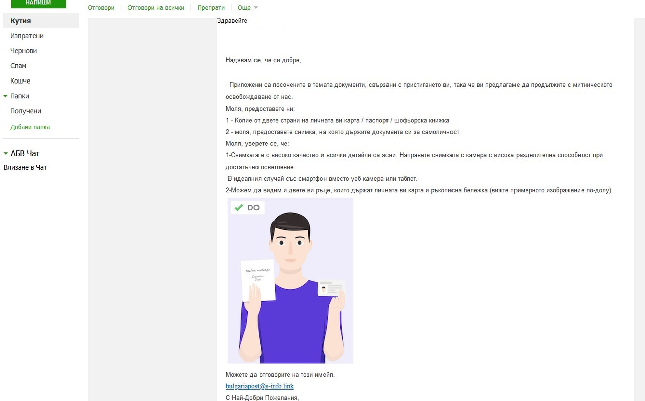 È àç ïîëó÷èõ ñúùîòî ïèñìî ïðåäè ìàëêî,çà ìàëêî äà ñå ïîäâåäà ,íî ïúðâî ïèñàõ äî åêèïà íà ÀÁ Ïîùà, ïî-òî÷íî äî àäìèí íà òàçè åëåêòðîííà ïîùà è ïîëó÷èõ îòãîâîð,÷å òîâà ñà çëîñòîðíèöè è ÷å ïèñìîòî íå å èçïðàòåíî îò åêèï íà ÀÁÂ, çàùîòî íÿìà òÿõíàòà èêîíà îò ñòðàíè íà ïèñìîòî,êîÿòî äà ïîòâúðäè ,÷å å ïðàòåíî îò òÿõ.Òåõíèòå ïèñìà ñà ñúñ ñúäúðæàíèå ñúñ çåëåíàòà èêîíêà íà ÀÁ Ïîùà, êîÿòî èêîíà âñè÷êè ïîçíàâàò è òàêà ñå ðàçëè÷àâàò îò îáèêíîâåíèòå ïîòðåáèòåëñêè ïèñìà. Òà çà ìàëêî äà ñè äàì ïàðîëàòà íà òàêèâà çëîñòîðíèöè.