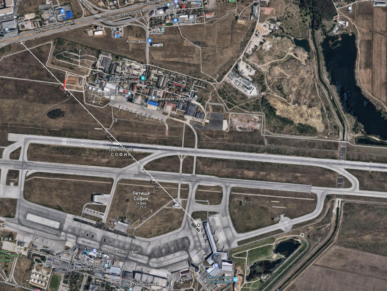 Ñíèìàõ îò òîâà ìÿñòî íà Áîòåâãðàäñêî. Íà ïúðâàòà ñíèìêà å íà åäíà ëèíèÿ ñ ðúêàâèòå íà òåðìèíàëà è âå÷å å âúâ âúçäóõà. Çíà÷è å îòëåïèë 50-òèíà ìåòðà ïðåäè òîâà, ò.å. êúì 2/3 îò ïèñòàòà. Íî â ñðàâíåíèå ñ èçëåòåëèòå ïðåäè íåãî 320-êè, äîñòà ïî-êúñíî è äîñòà ïî-òðóäíî íàáðà âèñî÷èíà. Ïîíàòîâàðåí áåøå. Îãðàäàòà êîÿòî ñå âèæäà å â ÷åðâåíî íà êàðòèíêàòà