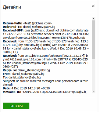 Ñåùàì ñå îùå íåùî......äà êîïèðàì òåêñòà îò ïîëó÷åíîòî ïèñìî è äà ñè ãî ïóñíà îòíîâî íà ìåí, íî òîçè ïúò ðåàëíî îò ìîÿò ìåéë. Àêî òîâà å íàïðàâåíî è ïî-ðàíî îò äðóã òî, õåäúðà áè òðÿáâàëî äà å åäíàêúâ, íàëè òàêà! Àêî ñå îêàæå, ÷å õåäúðà íà ìîåòî ïèñìî è íà ïî-ðàíî èçïðàòåíîòî ñå ðàçëè÷àâàò, òî òîâà áè òðÿáâàëî äà å ñêàì!!! Íåçíàì äàëè ðàñúæäàâàì ïðàâèëíî, íî êàêâî ùå êàæåòå äà ïðîáâàì!Last edited by DStefanov; 4th December 2019 at 14:50.