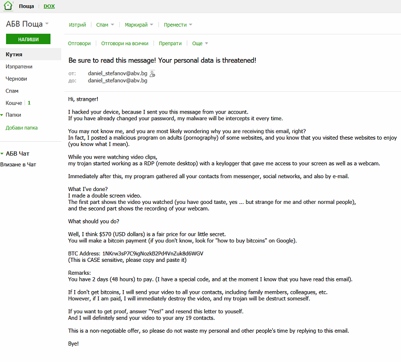 ï.ñ. Äíåñ ïî èìåéëà ïîëó÷èõ ñúîáùåíèå, â êîåòî ìå çàïëàøâàò, ÷å ùå ïóñíàò âèäåî è ò.í. ñ ìåí íà âñè÷êè ðîäíèíè, ïðèÿòåëè è ò.í., àêî íå ïëàòÿ 570$. Èíòåðåñíîòî å, ÷å ìåéëúò å ïóñíàò îò ìîéòà ñîáñòâåíà ïîùà, íî ïúê èñòîðèÿòà íà ïîùàòà ìè êàçâà, ÷å íå å âëèçàíî îò äðóãî /÷óæäî/ IP, êîåòî íå ìè å ïîçíàòî. Òðÿáâà ëè äà ñå ïðèòåñíÿâàì çà íåùî èëè òîâà å àêî ìèíå íîìåðà è ïëàòÿ?